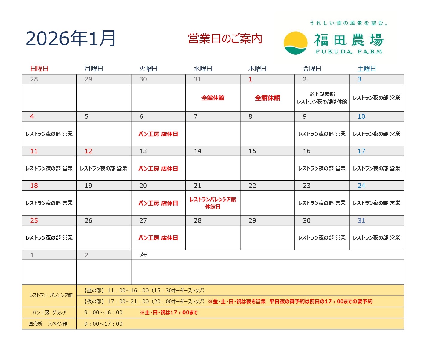 1/2(金) レストランバレンシア館 11:00~15:00ラストオーダー、夜の部お休み